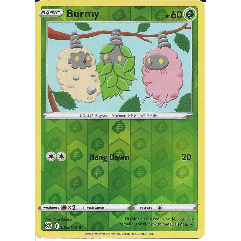 009/172 Burmy (Reverse Holo) #0412 (Japanese: ミノムッチ Minomucchi) / Basic / Common (Brilliant Stars) Sword & Shield. (Bug Pokémon) English card. Introduced in Generation IV. Evolves into Wormadam or Mothim.