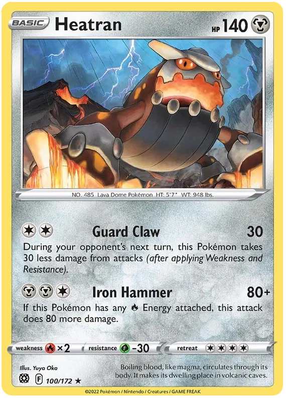 Ignite your collection with Heatran, card 100/172 from Brilliant Stars! 🔥 This powerful Fire/Steel-type Pokémon is a legendary guardian said to dwell deep within volcanic caverns. Its molten blood and metallic armor make it nearly unstoppable, combining the fury of magma with the resilience of steel.