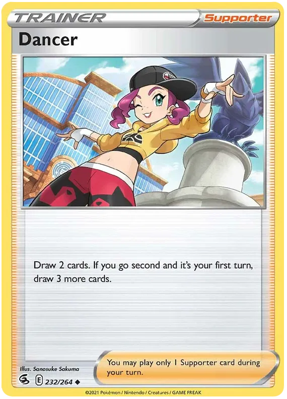 Add rhythm and energy to your battle with Dancer, card 232/264 from Fusion Strike! This Uncommon Trainer – Supporter card brings movement and motivation to your deck — draw 2 cards, and if your opponent’s Active Pokémon is a Fusion Strike Pokémon, draw 2 more! It’s a stylish and strategic card that rewards timing and awareness. Perfect for Fusion Strike decks or collectors who love cards with flair and personality!